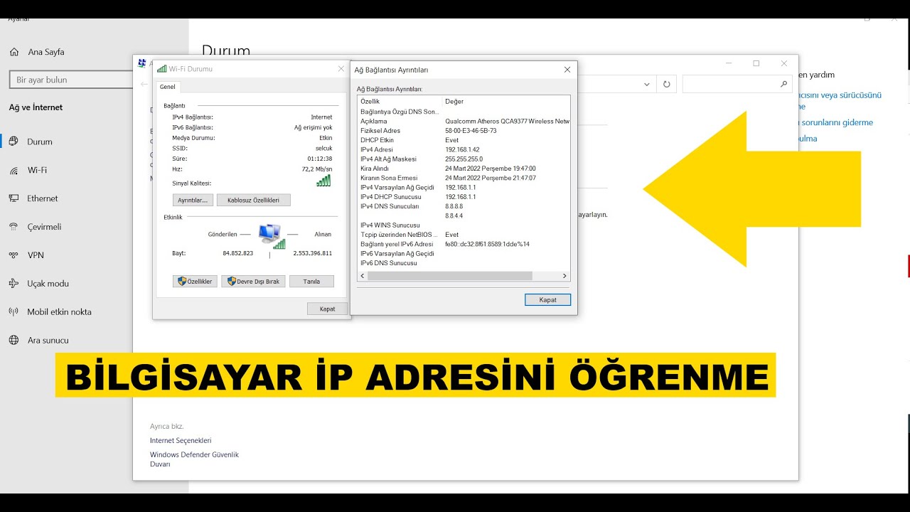 - ipconfig komutunu kullanarak حال mevcut IP adresinizi öğrenin.